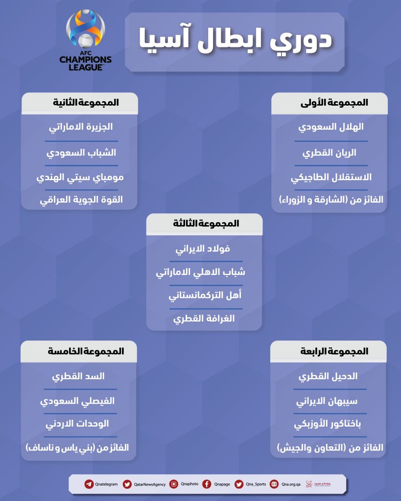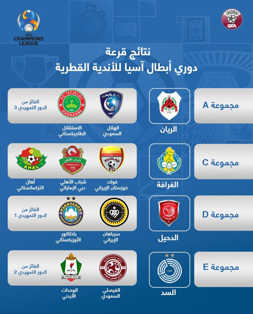 وأوقعت القرعة، نادي الهلال السعودي حامل اللقب في المجموعة الأولى بمواجهة أندية الريان القطري، والاستقلال الطاجيكي، والفائز من الدور التمهيدي “3”.