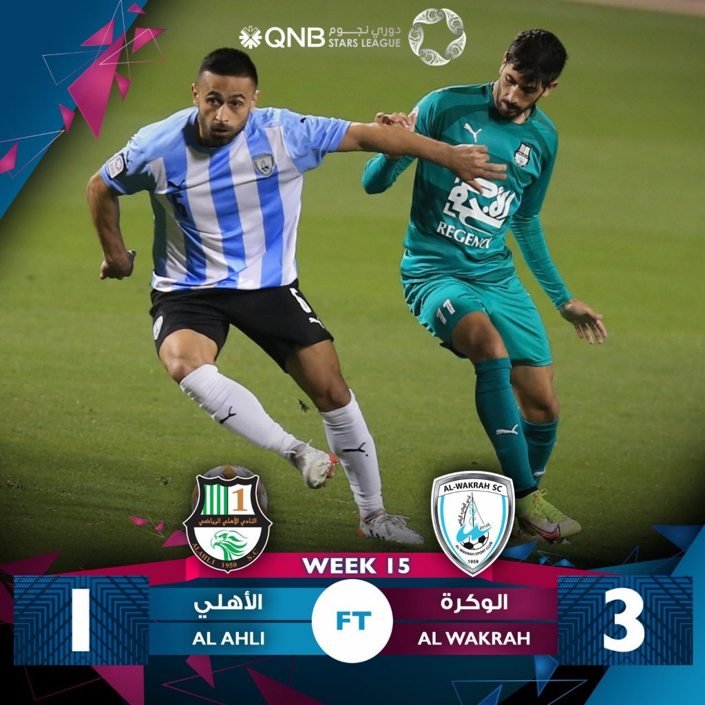 واصل الوكرة الانتصارات في دوري نجوم QNB للموسم 2021- 2022، حيث تغلب على الأهلي بثلاثة أهداف مقابل هدف، ضمن مباريات الأسبوع الخامس عشر، والتي أقيمت على استاد حمد بن خليفة بالنادي الأهلي، مساء اليوم الإثنين .