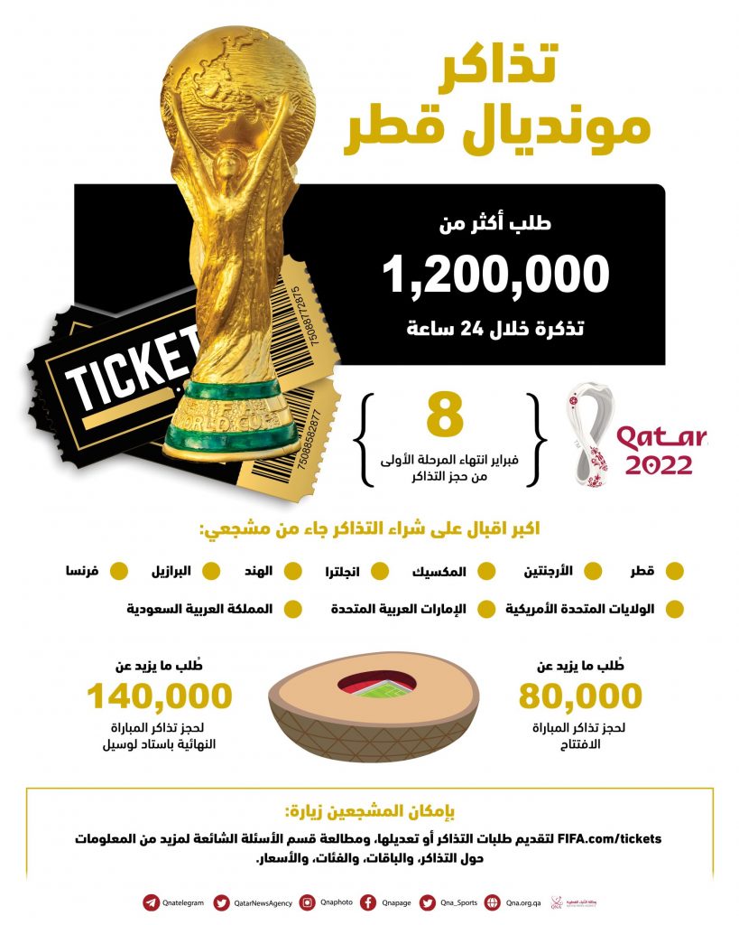 وسجلت أرقام أول 24 ساعة من فتح باب حجز تذاكر المونديال طلب ما يزيد على 140 ألف تذكرة للمباراة النهائية التي تقام في 18 ديسمبر في استاد لوسيل، كما طُلب ما يزيد على 80 ألف تذكرة لمباراة الافتتاح.