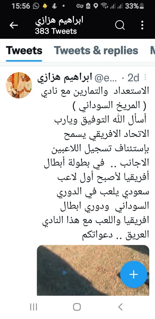 رؤية سبورت : أ علن اللاعب السعودي إبراهيم هزازي لاعب المنتخب السعودي السابق واندية الأهلي والاتحاد جدة والاتفاق أنه بصدد خوض تجربة احترافية مع نادي المريخ السوداني ستجعل منه اللاعب السعودي الأول الذي يحترف في الدوري السوداني، والسعودي الأول الذي يخوض تجربة اللعب بدوري أبطال أفريقيا ،الذي بلغ فيه المريخ دور المجموعات ويستعد لخوض التحدي الأفريقي ضمن مجموعة تضم إلى جانبه الهلال السوداني والأهلي المصري وصنداونز الجنوب إفريقي، وأعرب الهزازي في تغريدة على حسابه الرسمي بموقع التواصل الإجتماعي تويتر عن رغبته بأن تكتمل امنيته باللعب ضمن صفوف نادي المريخ السوداني قائلا يشرفني ارتداء شعار هذا النادي العريق.