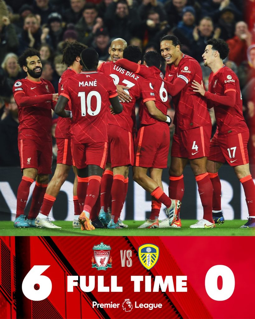 الا ان كلووب ونجومه خالفوا كل التوقعات واكتسحوا لیدز یونایتد .بسداسیة ابتدرها محمد صلاح بضربۃ جزا۽ في الدقیقة الخامسۃ عشر ..مما ازاح بعض القلق اذ ان لیدز ..هو لیدز ..سرعة فی اللعب والتمریرات السریعة المتقنة ..والتحرك بكرۃ وبدونها ..الا ان ابنا۽ كلووب اتضح انهم كانوا عازمون علی الا یضیعوا هدیۃ هاری كین ..لتضییق الخناق ..علی السیتی …الی ثلاث نقاط,..فی انتظار باقی الجولات…د.30 عزز الأهداف ماتيب المنخرط لیمرر كرۃ الی الجانب الایمن .ویواصل تقدمه لیتلقی باص خلف مدافعی لیدز لیرسلها من لمسة واحدة فوق الحارس هدفا ثانیا وجمیلا ..وغیر متوقع من مدافع وفي .د.35 يسجل محمد صلاح من ضربۃ جزا۽ ارتكبت ضد سادیو مانییه الذی كان فی وضع انفراد بحارس لیدز، انتهی علیها شوط اللعب الاول.