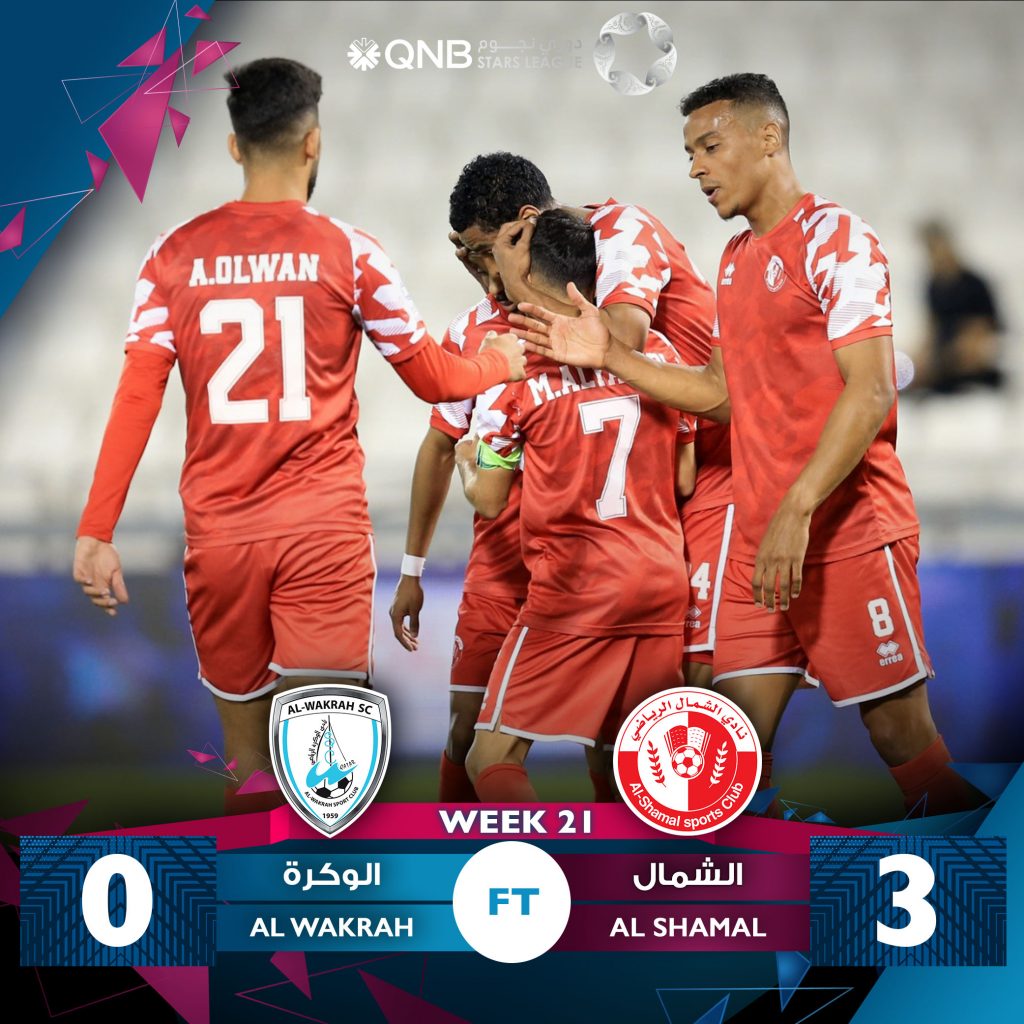 ورفع الشمال رصيده إلى 22 نقطة في المركز التاسع، في المقابل توقف رصيد الوكرة عند 37 نقطة في المركز الثالث، وضمن إنهاء الدوري في هذا الموقع.