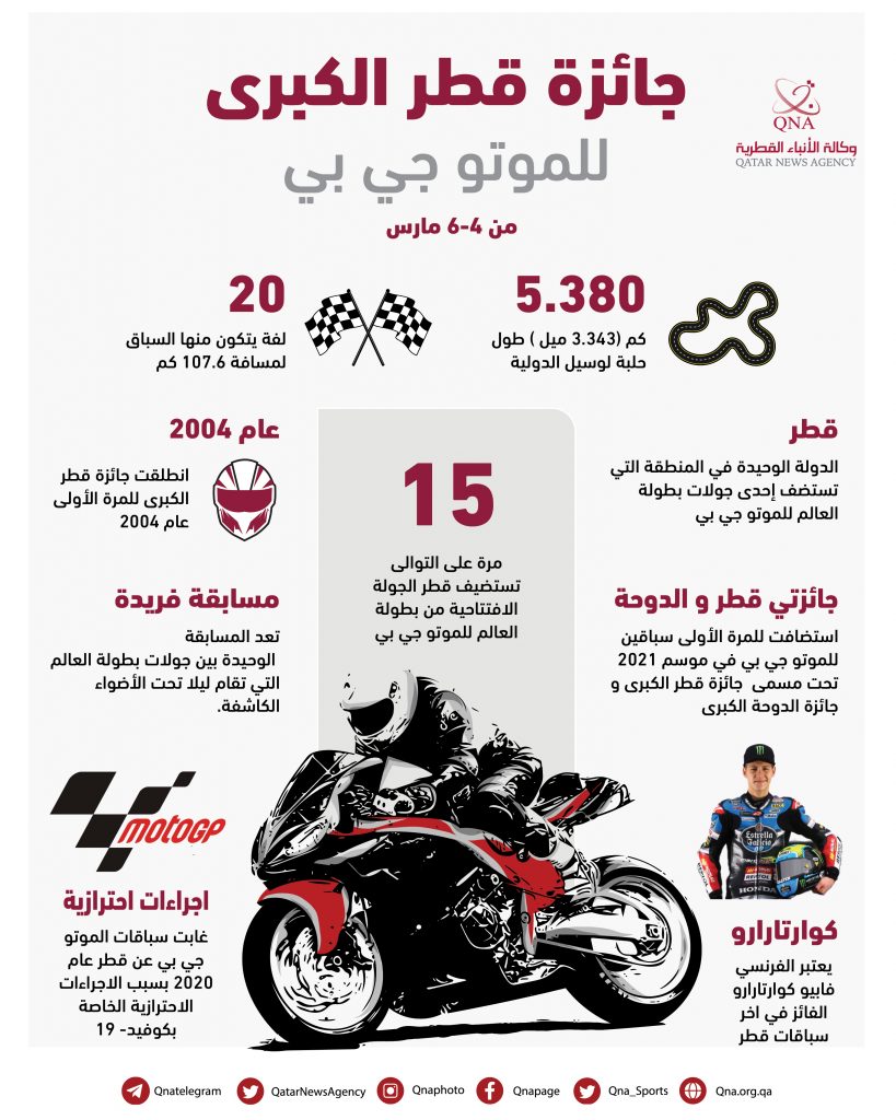 الدوحة /قنا/ تستعد الدوحة لكتابة قصة نجاح جديدة ستبهر العالم، بتنظيم جائزة قطر الكبرى، أولى جولات بطولة العالم للدراجات النارية /الموتو جي بي/ للموسم 2022، وهو الحدث الأهم في البطولة العالمية كونه الجولة الافتتاحية، معتمدة على نخبة من أبنائها المبدعين الذين يعملون بروح واحدة، ويشكلون قاطرة النجاح في الرياضات الميكانيكية.