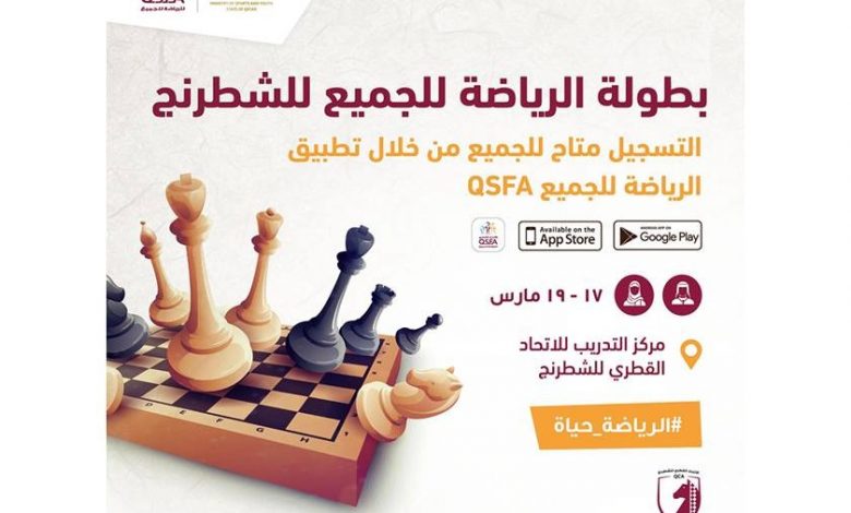 الدوحة: أنهى الاتحاد القطري للرياضة للجميع كافة التحضيرات لانطلاق البطولة المحلية للشطرنج، وذلك بالتعاون مع الاتحاد القطري للعبة والتي يستضيف منافساتها المركز التدريبي لاتحاد الشطرنج خلال الفترة من 17 وحتى 19 مارس الجاري وستكون المشاركة فيها مفتوحة للرجال والسيدات.
