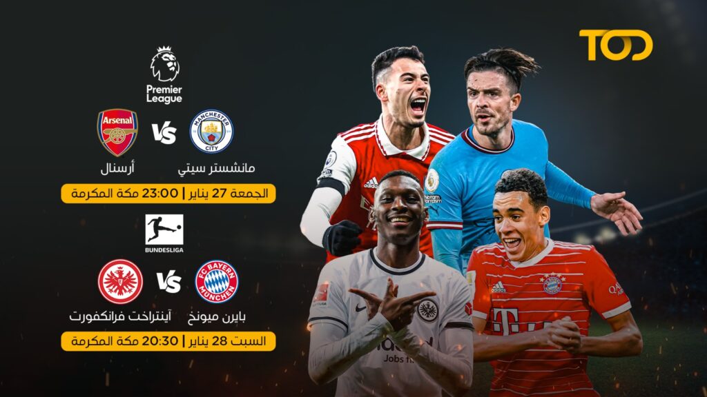أعلنت منصة TOD، الرياضية والترفيهية الرائدة في الشرق الأوسط وأفريقيا انها ستوفر بث مباشر للجولة الرابعة من كأس الاتحاد الإنجليزي ومباراة الدوري الألماني المرتقبة. ستُعرض الجولة الرابعة من كأس الاتحاد الإنجليزي، مانشستر سيتي X أرسنال، والدوري الألماني، بايرن ميونيخ X آينتراخت فرانكفورت، مباشرة لعشاق كرة القدم في منطقة الشرق الأوسط وشمال أفريقيا في عطلة نهاية الأسبوع على منصة TOD.