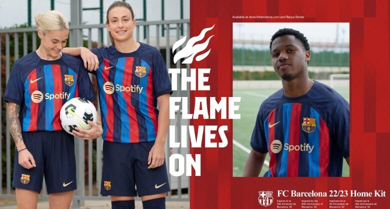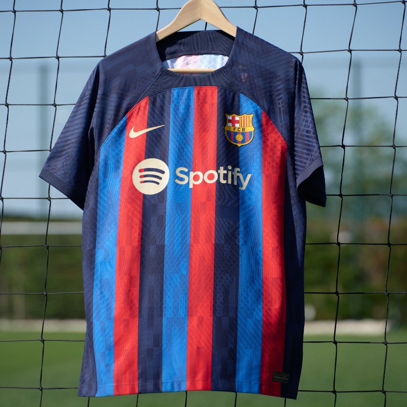 وظهر على القميص شعار الراعي الرئيسي الجديد للنادي الكتالوني شركة “سبوتيفاي” الذي سيكون موجودا على قميص الفريق الأول للرجال والسيدات.