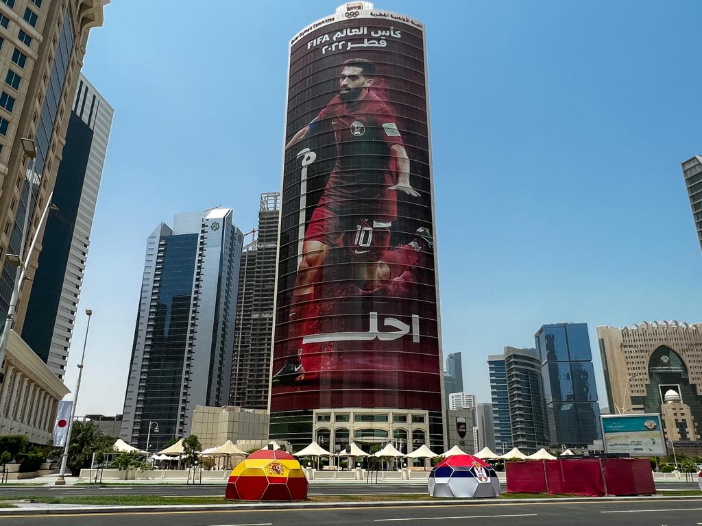 مبنى اللجنة الأولمبية القطرية تزين بألوان “الأدعم”، حيث طالبت اللجنة بالتشجيع بصوت واحد ومساندة المنتخب القطري بكل قوة في المونديال العالمي.. فمن خلال الملصق الذي حمل صورة الكابتن والقائد المخضرم حسن الهيدوس، تم إرسال رسالة للجماهير القطرية من أجل المؤازرة والتشجيع لتحقيق نتائج مميزة في البطولة المنتظرة.