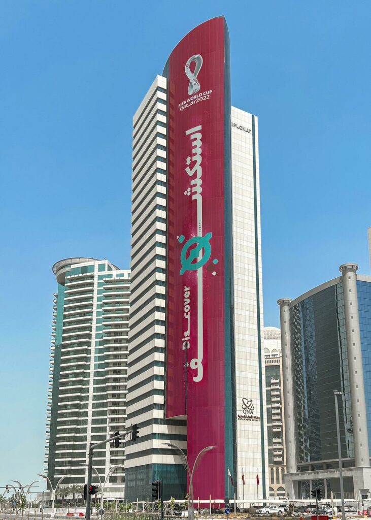 مبنى وكالة الأنباء القطرية من المباني التي توشحت بشعار يحمل عنوان “استكشف” باللغتين العربية والإنجليزية، وقد امتد على طول المبنى، ويمكن مشاهدته من جميع الجهات.. فالإعلام شريك أساسي في إنجاح التظاهرات الكبرى واختيار هذا الشعار لم يأت من فراغ.