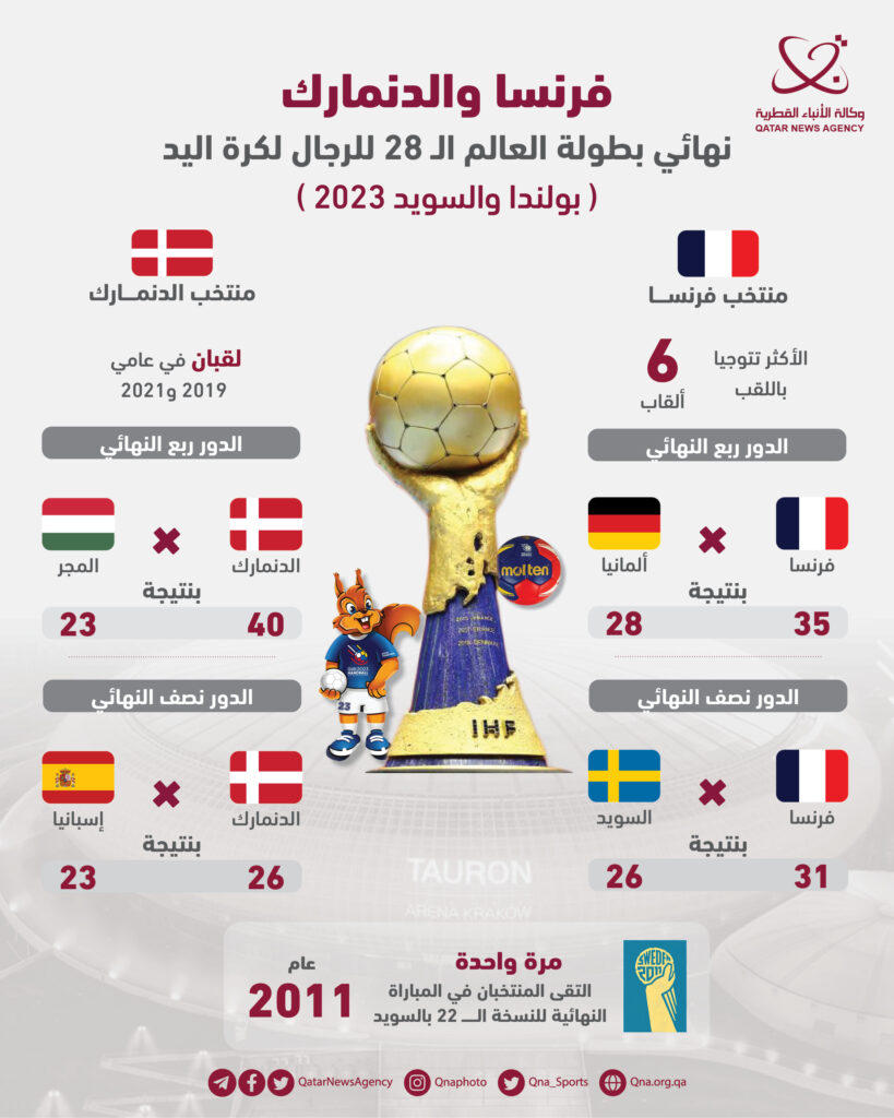 ستوكهولم: توج المنتخب الدنماركي، بلقب بطولة العالم لكرة اليد للرجال للمرة الثالثة على التوالي وذلك بعد فوزه، على نظيره الفرنسي (34 – 29 ) في نهائي النسخة الثامنة والعشرين من البطولة، /بولندا والسويد 2023/، في المباراة التي أقيمت بالسويد.