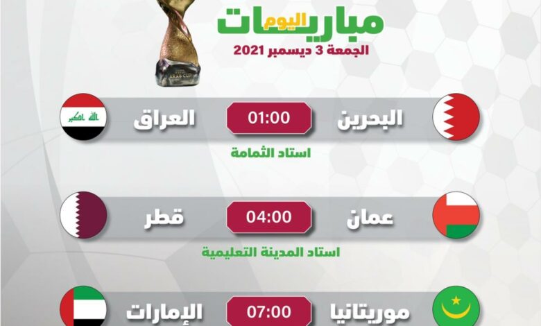 تشهد منافسات بطولة كأس العرب اليوم إقامة ٤ مباريات أولها بين العراق والبحرين في الواحدة ظهرا ويلتقي منتخب قطر نظيره العماني في تمام الرابعة عصرا، بينما يلتقي منتخبا موريتانيا والإمارات عند السابعة مساء، ويلتقي في المباراة الرابعة والأخيرة اليوم منتخبا سوريا وتونس
