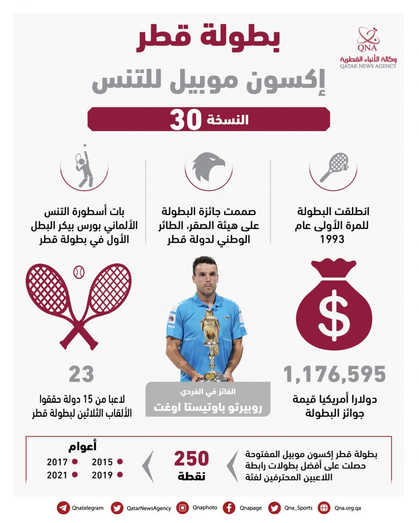 الدوحة: رؤيةسبورت– توج الإسباني روبرتو باوتيستا آغوت بلقب النسخة الثلاثين من بطولة قطر إكسون موبيل المفتوحة للتنس للرجال، والتي ينظمها الاتحاد القطري للتنس والاسكواش والريشة الطائرة على ملاعب مجمع خليفة الدولي، وذلك بمشاركة مميزة من المصنفين الأوائل على العالم.