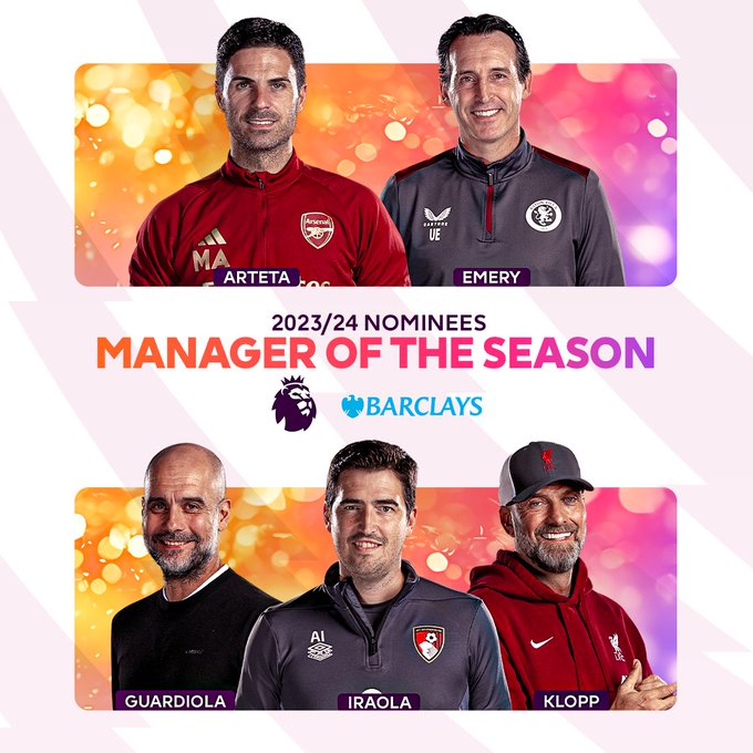 وفتحت رابطة الدوري الإنجليزي باب التصويت للجمهور عبر موقعها الرسمي لاختيار المدرب الأفضل حتى يوم /الإثنين/ المقبل، على أن يتم الكشف عن الفائز بالجائزة يوم الثلاثاء 21 مايو الجاري.