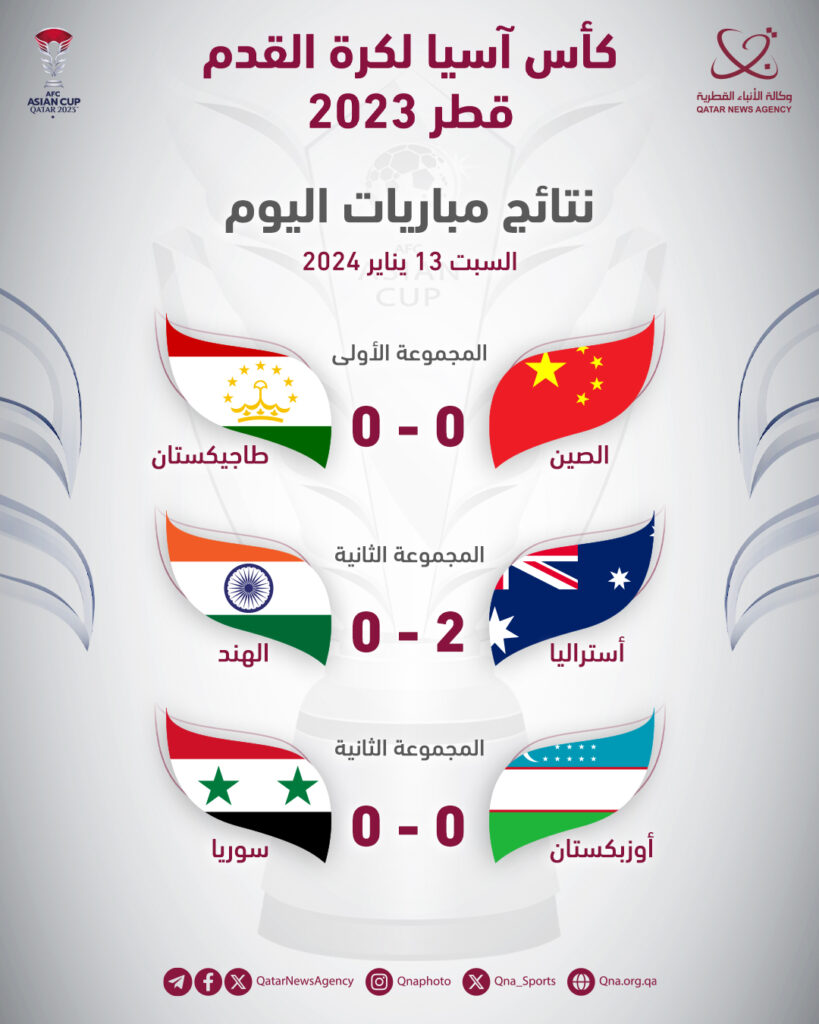 وشهدت مباريات أمس في البطولة فوز المنتخب الأسترالي على نظيره الهندي بهدفين دون مقابل، كما تعادل منتخبا سوريا واوزبكستان بدون أهداف.