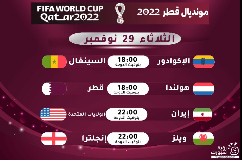 تقام اليوم أربعة مباريات في الجولة الثالثة من دور المجموعات في بطولة كأس العالم قطر 2022 وسوف تقام كل مباراتين بالتزامن كالتالي: