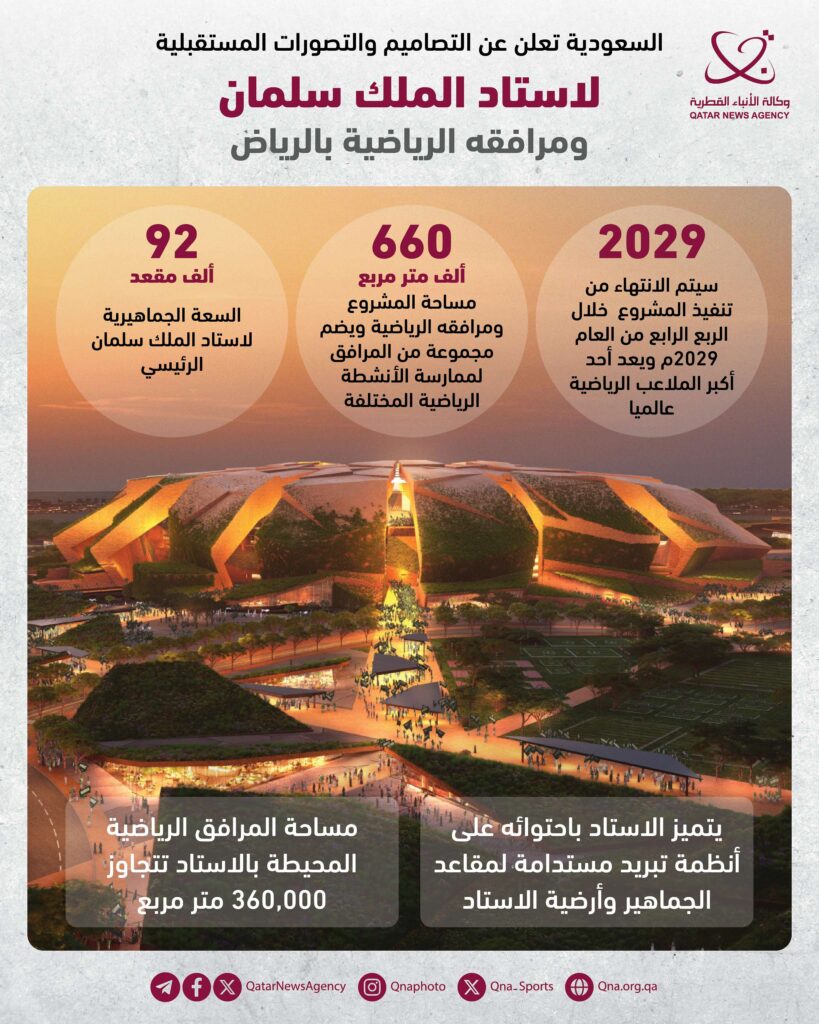 السعودية تعلن تصاميم استاد الملك سلمان بسعة 92 ألف متفرج.. ومرافق رياضية ضخمة
