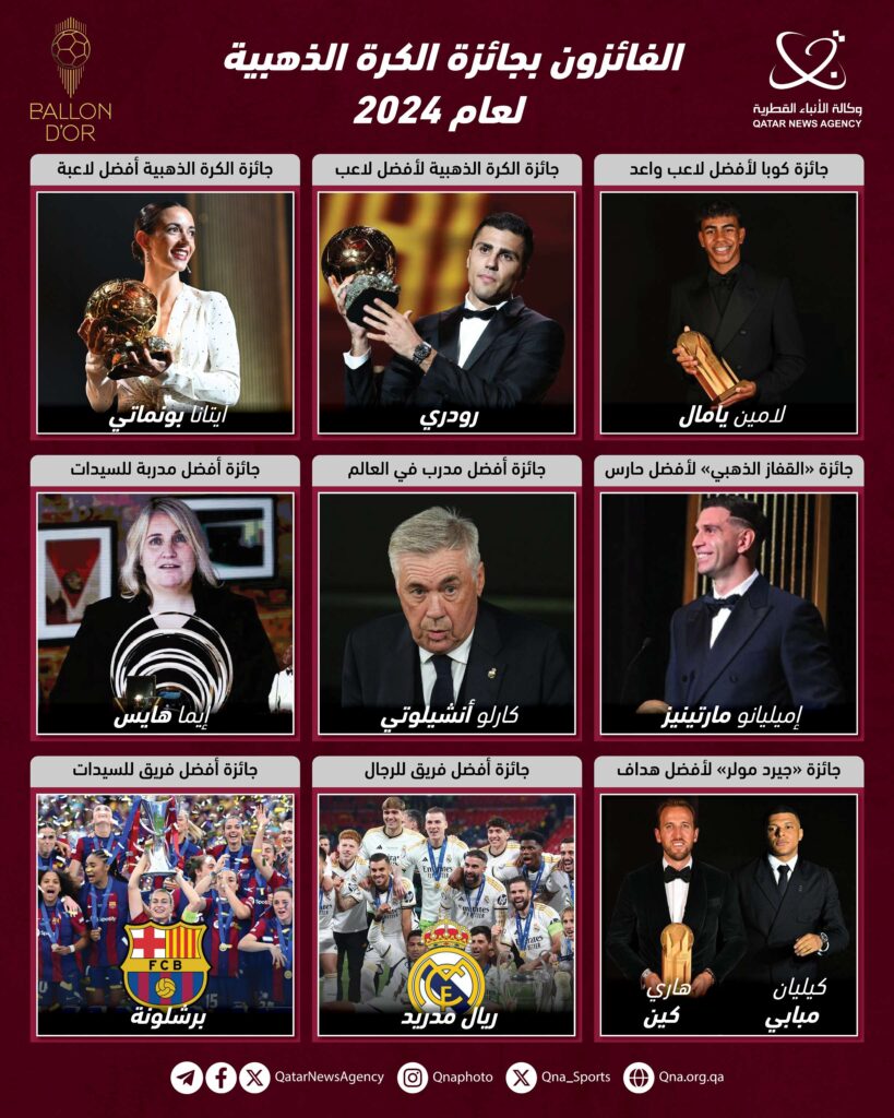 وتوج لامين يامال نجم منتخب إسبانيا ونادي برشلونة بجائزة كوبا لأفضل لاعب شاب في العالم، فيما اقتسم هاري كين نجم المنتخب الإنجليزي ونادي بايرن ميونيخ الألماني، وكيليان مبابي نجم منتخب فرنسا ونادي ريال مدريد الإسباني، جائزة جيرد مولر لأفضل هداف في العالم (سجل كل منهما 52 هدفا خلال موسم 2023 – 2024).